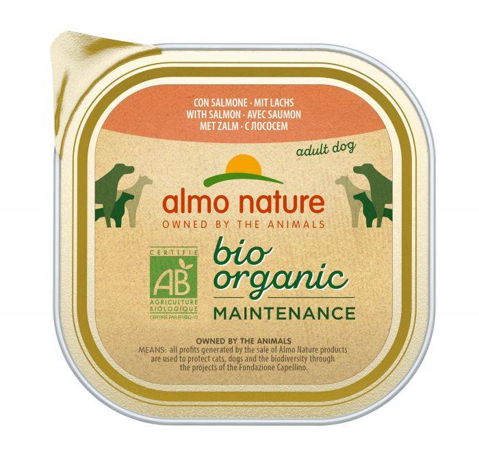 Bio Organic Maintenance range of wet food recipes are made with ingredients produced in compliance with the organic farming supply chain and the relevant EU directives. Complete and nutritionally balanced wet food formula which caters for a large number of adult dogs, thanks to the variety of their ingredients (muscle meat, (sh, organ meat and vegetables). Free of arti(cial preservatives or colours. The aluminium packaging is recyclable and, if disposed of properly, can be reused for more packaging. Bio Organic Maintenance – pâté form recipe – available in 100 g and 300 g trays. Almo Nature is the activist pet food brand owned entirely by Fondazione Capellino.