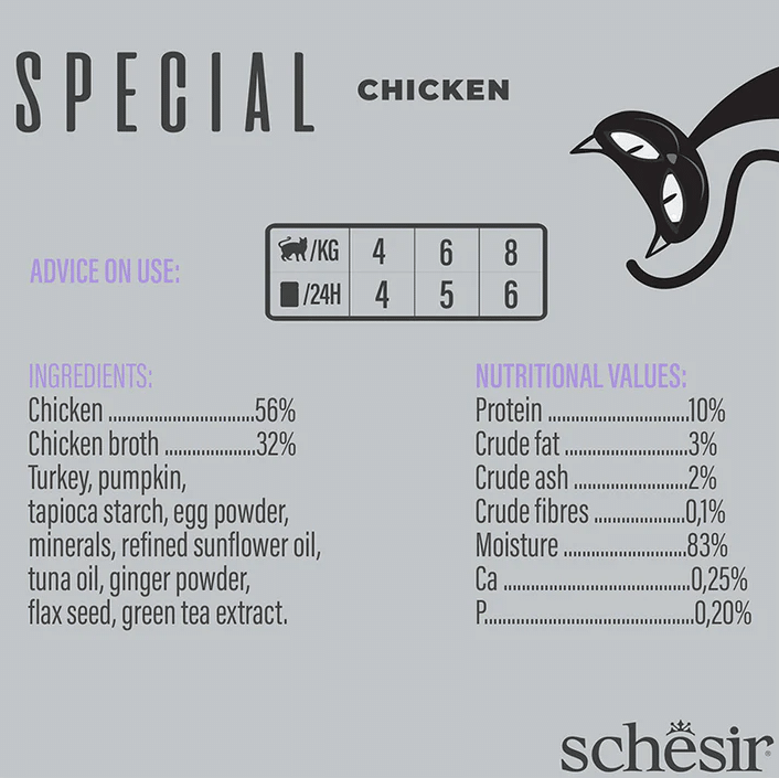 A recipe specifically formulated for cats with a tendency to be overweight, with a lower calorie count than the other Schesir mousses for adult cats; based on real chicken meat, with the addition of turkey blended, into a soft and velvety mousse.Why choose this product